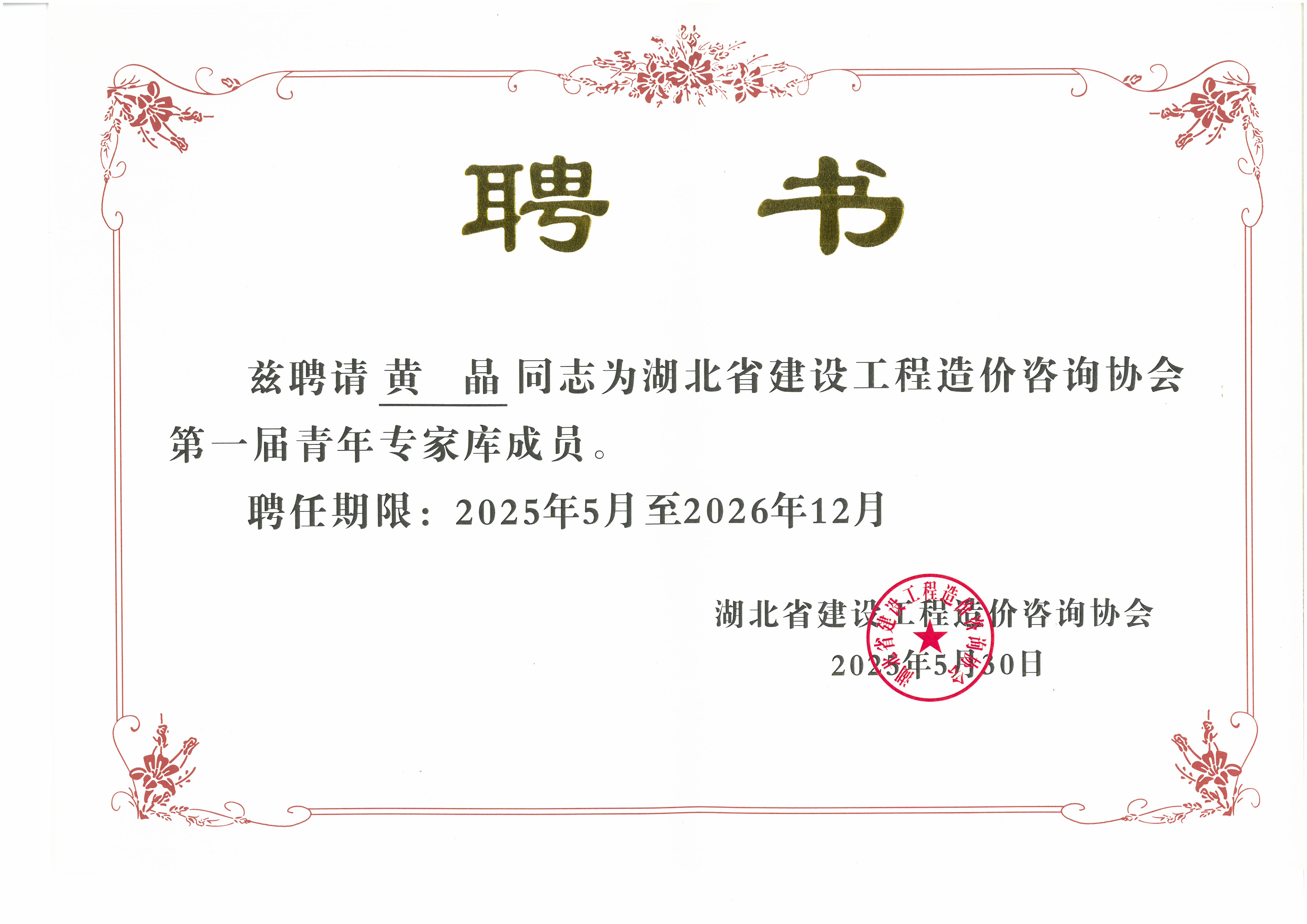 此次入選湖北省建設(shè)工程造價咨詢協(xié)會第一屆青年專家?guī)?,不僅是對黃晶個人專業(yè)能力的高度認(rèn)可,更是對我司在工程造價領(lǐng)域?qū)I(yè)水平的肯定。這既是一份榮譽(yù),更是一份責(zé)任。